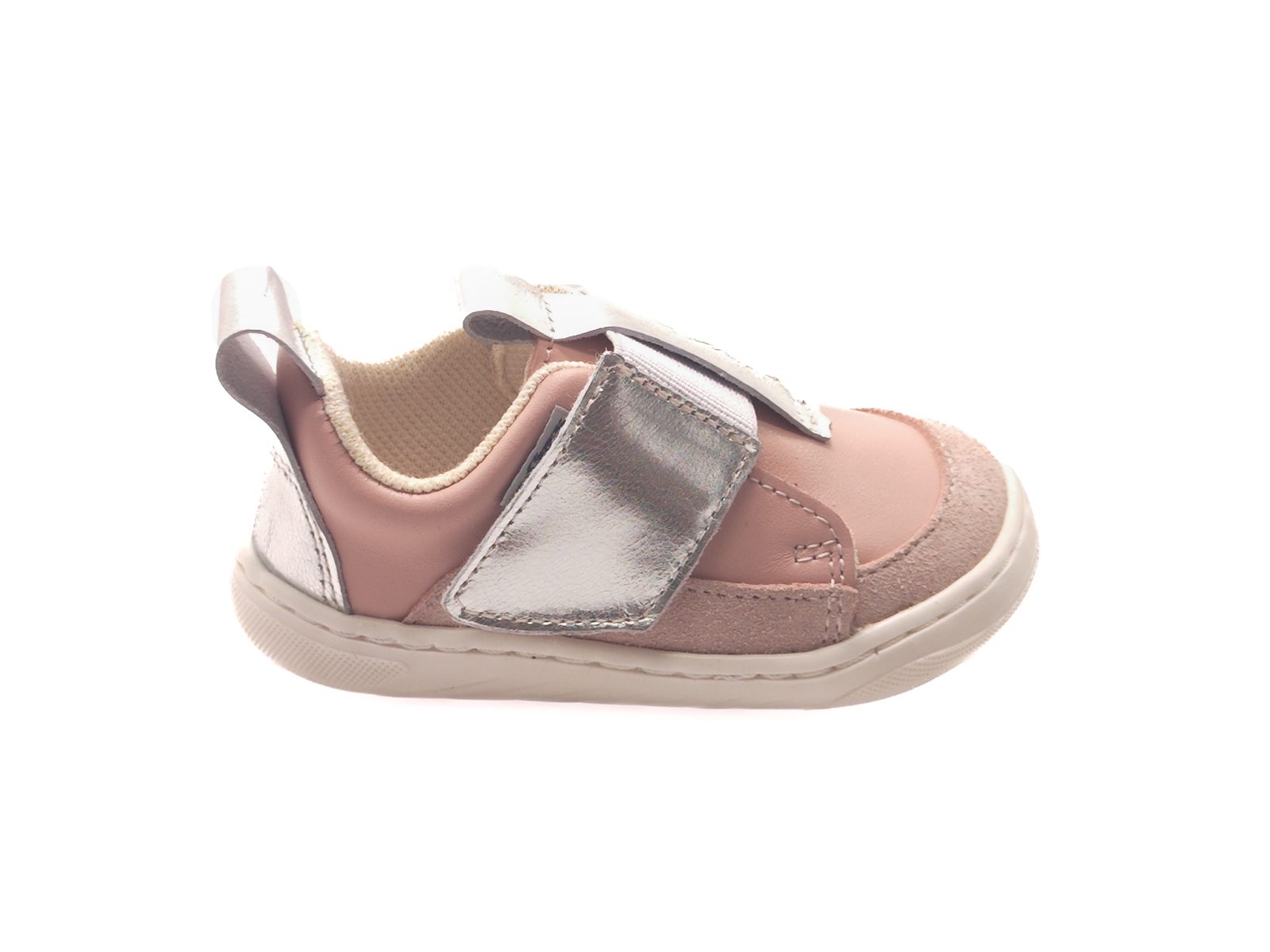 Leather first walkers with a breathable textile lining and easy fastening with an elastic band across the instep. Thanks to the reinforced heel, they keep their shape perfectly, while the barefoot construction ensures lightness, flexibility and the natural development of little feet. The suede leather toe cap provides protection against scuffing.